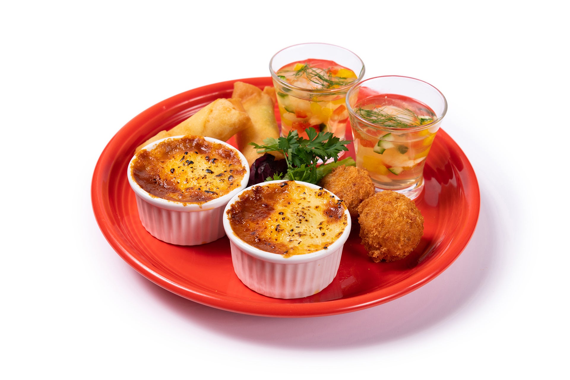 下段 サーモンとクリアトマトのジュレ、アッシェドパルマンティエ(牛肉赤ワイン煮込み)、ローマ風ライスコロッケ、エビとチョリソースティック、野菜と押し麦のスープ