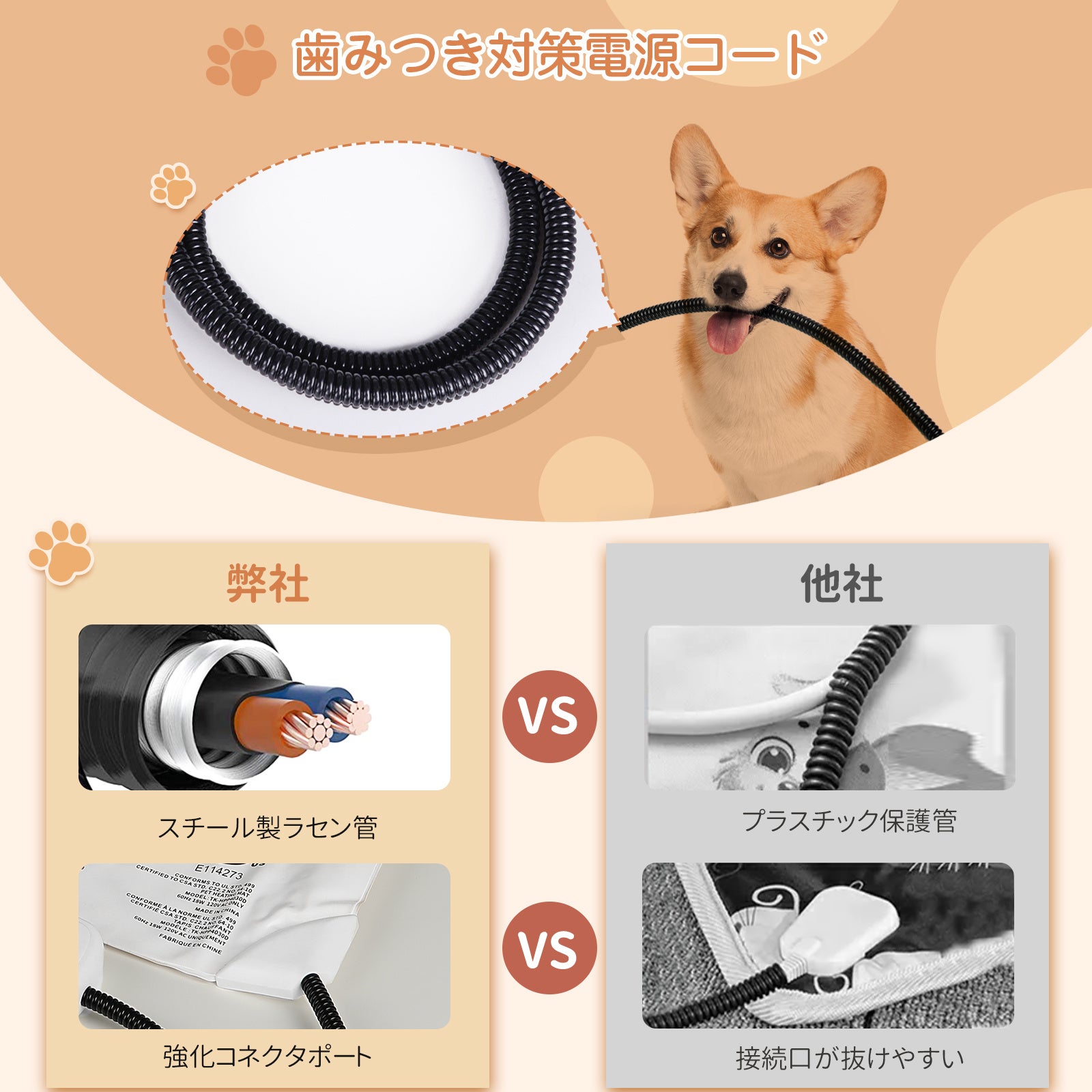 1、ペットヒーターのコードは、噛みつき防止のラセン管で保護されており、高い耐久性と優れた感電防止策が施されています。噛み癖のあるワンちゃんやネコちゃんを感電の危険から守ります。