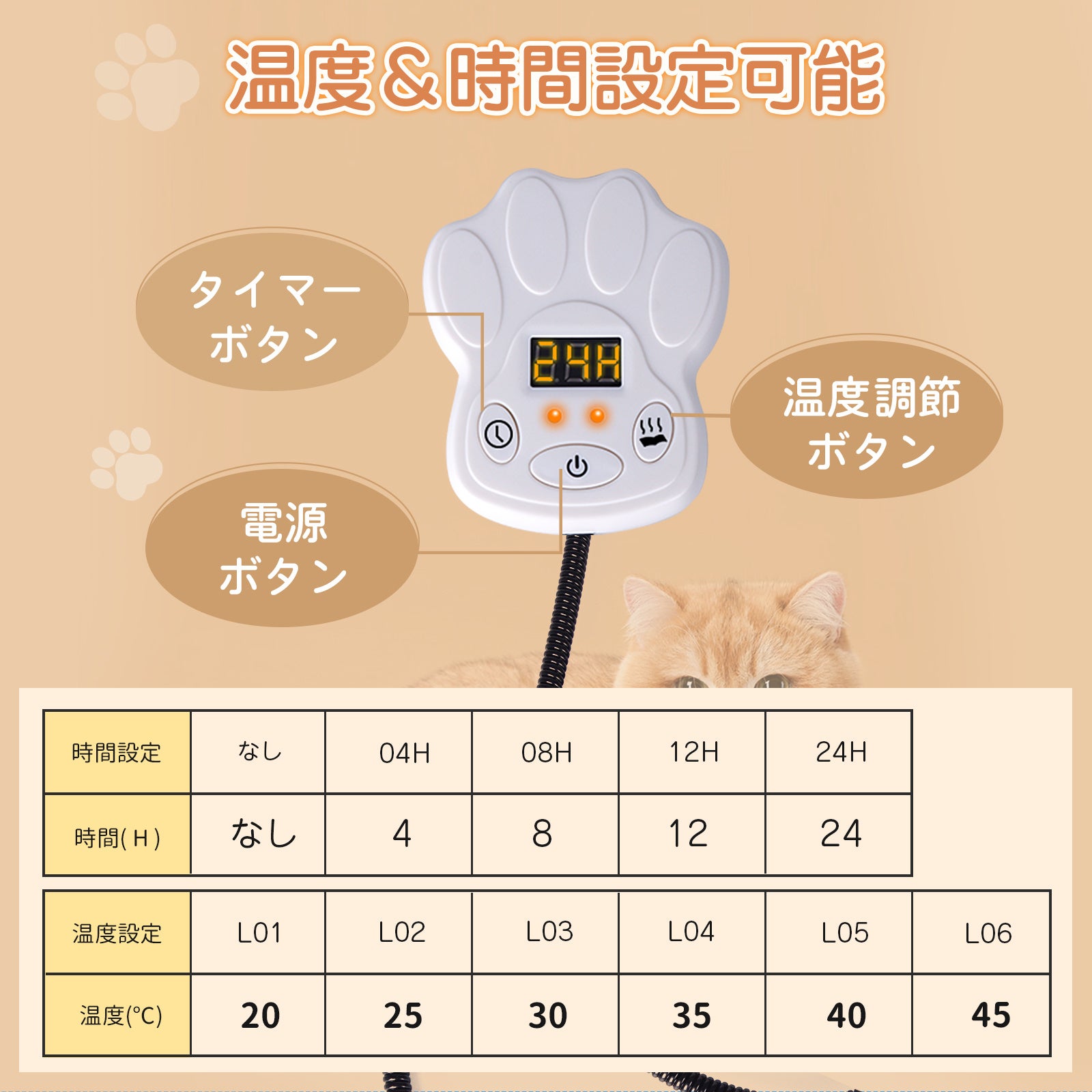 20℃~45℃まで、5℃ずつ設定温度の調節が可能で、ペットの体質に合わせた温度に調節することができます。ご需要に応じて適切な時間(0/4/8/12/24H)を設定することができます。