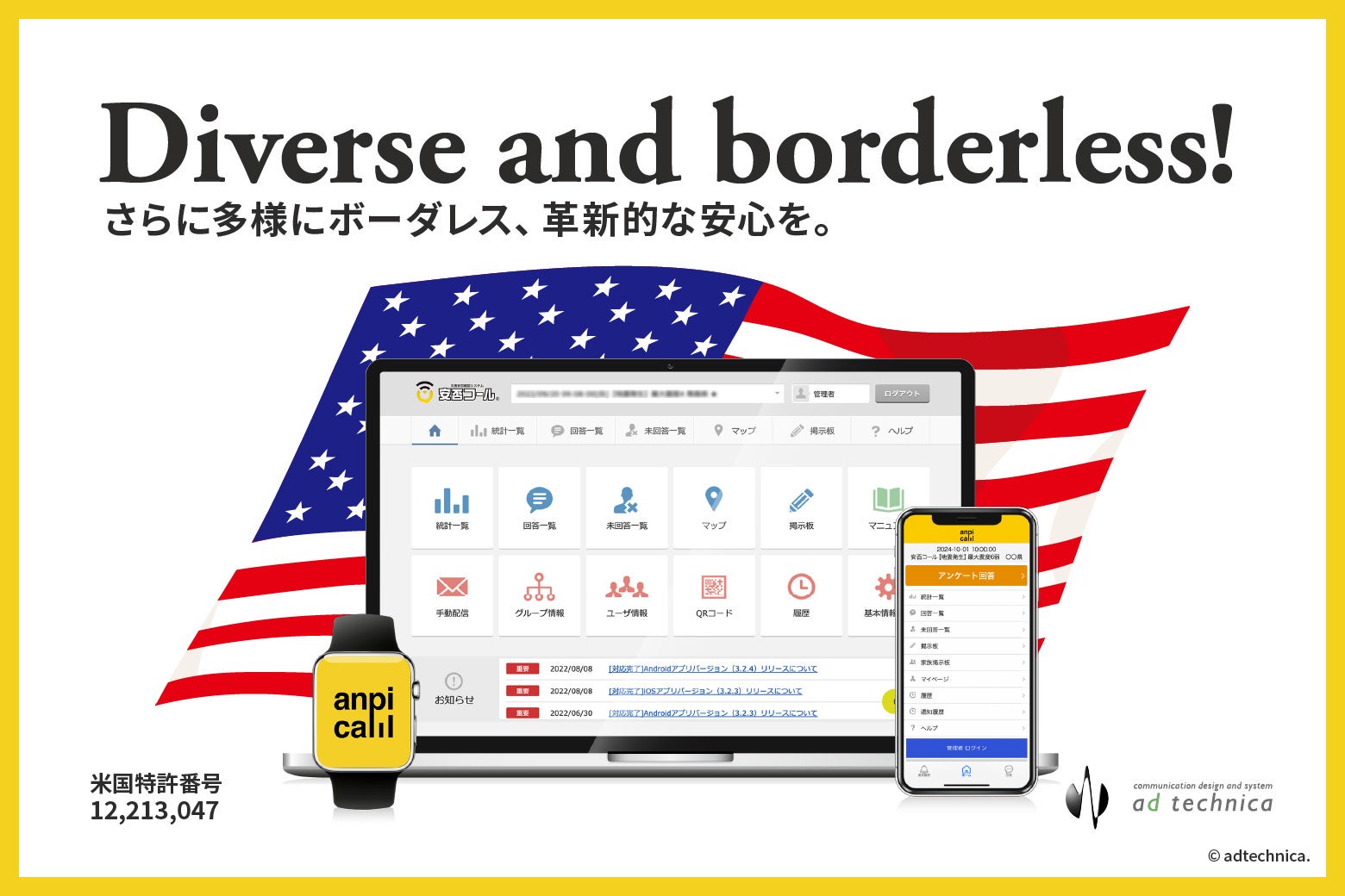 株式会社アドテクニカ(本社:静岡県静岡市、代表取締役:下村聡、以下「アドテクニカ」)は、安否確認システム「安否コール」の「IoT Connect」機能に関する技術で米国特許を取得しました。この特許技術は、地震や津波、大雨、大雪といった自然災害通知などをウェアラブルデバイス、さらにはロボットを含む多様なIoTデバイスに自動配信する革新的なインテリジェンスを実現します。