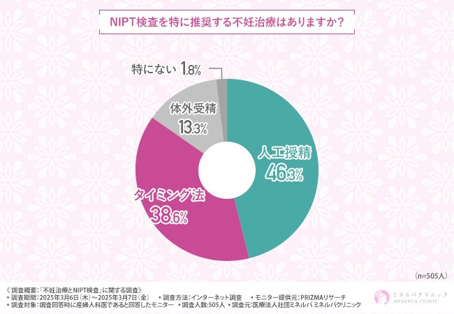 はじめに、「NIPT検査を特に推奨する不妊治療はありますか?」と質問したところ、『人工授精(46.3%)』と回答した方が最も多く、次いで『タイミング法(38.6%)』『体外受精(13.3%)』となりました。
