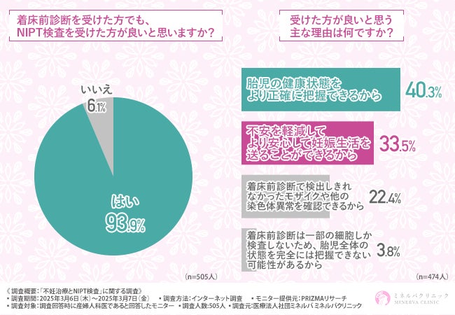 胎児の健康状態を把握し、妊娠中の不安を軽減してより安心できることから、着床前診断だけでなく、NIPT検査も受けた方が良いと思う産婦人科医が多いことが判明しました。