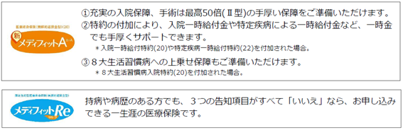 大変ご好評をいただいております2つの医療保険「新メディフィットA 〈 エース 〉 」、