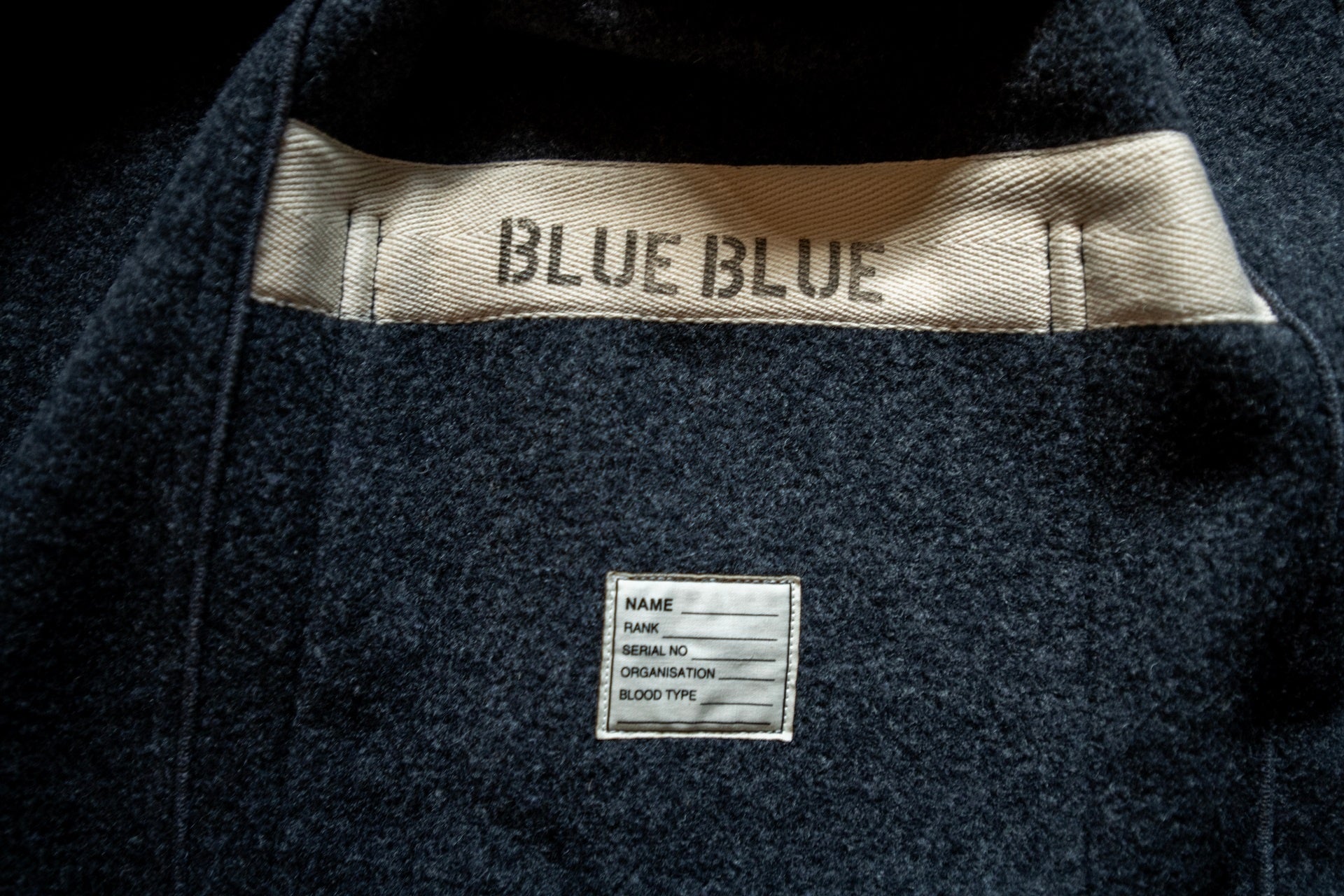 別注ポイントとして、内側のコットンヘリンボーンテープはすべてナチュラルカラーに変更し、左身頃裏には「BLUE BLUE」の手押しスタンプ、背裏には「Gloverall」と「BLUE BLUE」のロゴを配しました。