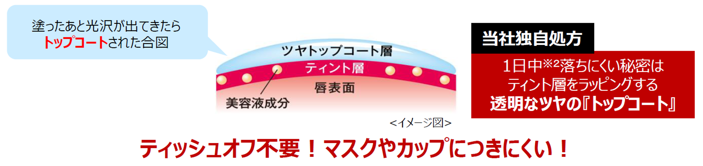 塗ってしばらくすると、ティント層の上に、透明なツヤトップコート層を形成。ティント層をしっかりコートし、つけたての色・ツヤ・うるおいをキープ!