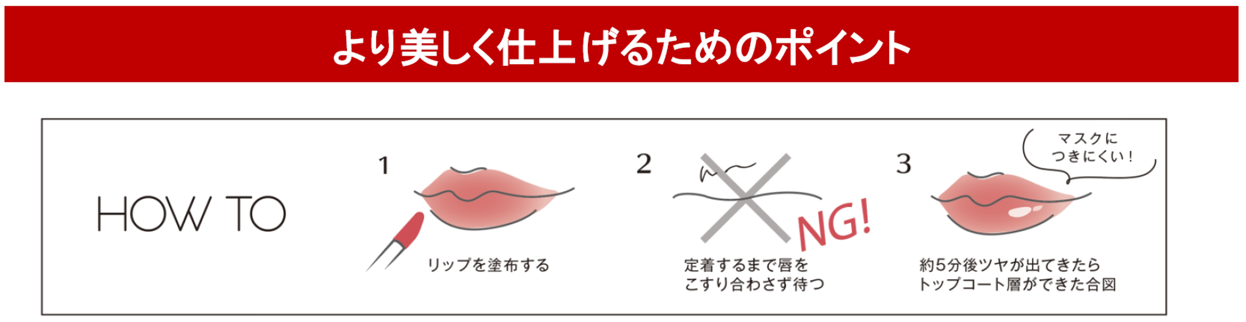 唇をこすり合わせるとトップコート層が形成されず、仕上がりがムラっぽくなったりツヤ感が減ってしまうため、定着するまで唇をこすり合わせず待ちます。