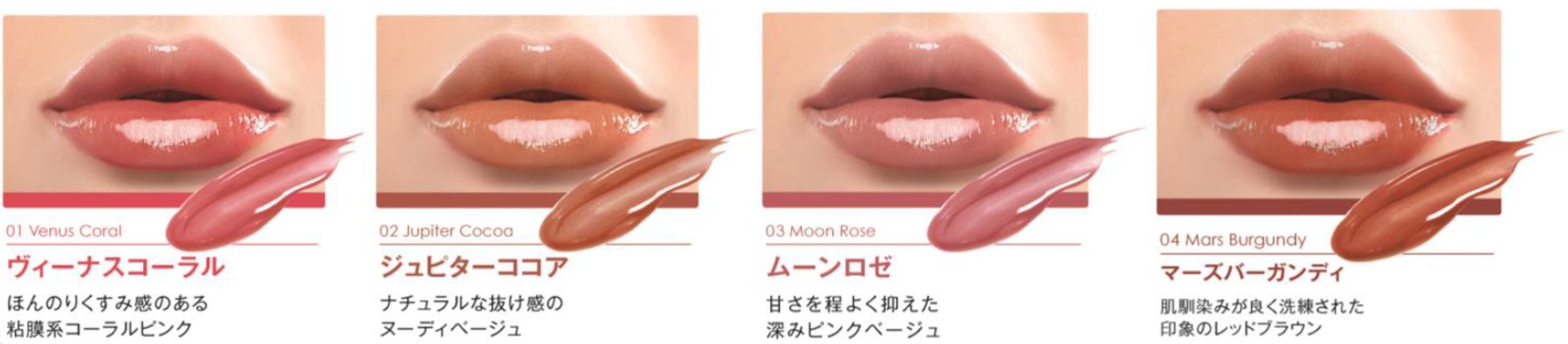 ガラスのようなツヤ仕上がり、高発色、使うたびにうるおう唇をぜひ体感してください。
