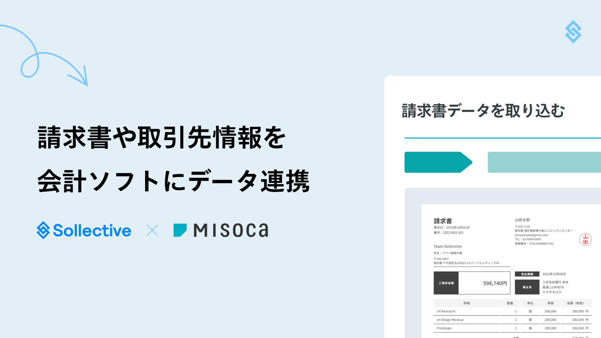 クラウド見積・納品・請求書サービス『Misoca』と API 連携を行ったことで、『請Q®︎ by Sollective』および『Misoca』の相互のサービスで、請求書データや取引先情報の自動連携が可能となりました。