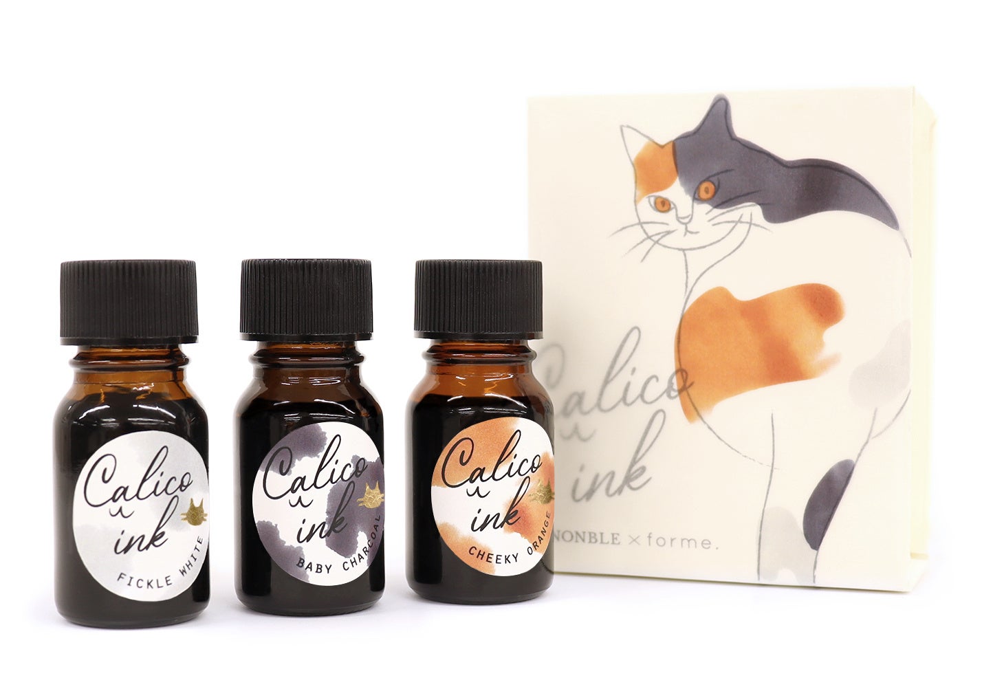 ガラスペンと同じく三毛猫をモチーフにしたインクセットが合わせて登場。本商品は京都の文具メーカーforme.とのダブルネームとなっています。