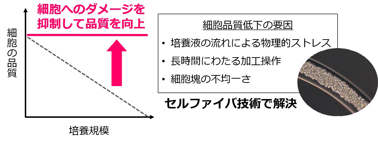 細胞ファイバ技術は、髪の毛ほどの細さの中空ハイドロゲル(※2)チューブ内に細胞を封入し、培養する技術です。周囲のゲルが内部の細胞を保護しつつ過剰な凝集を防ぐため、培養皿での平面培養や、バイオリアクターを用いた懸濁培養などの従来培養法に比べて、品質の良い細胞を高い密度で培養することができ、細胞の製造プロセスを効率化することができます。