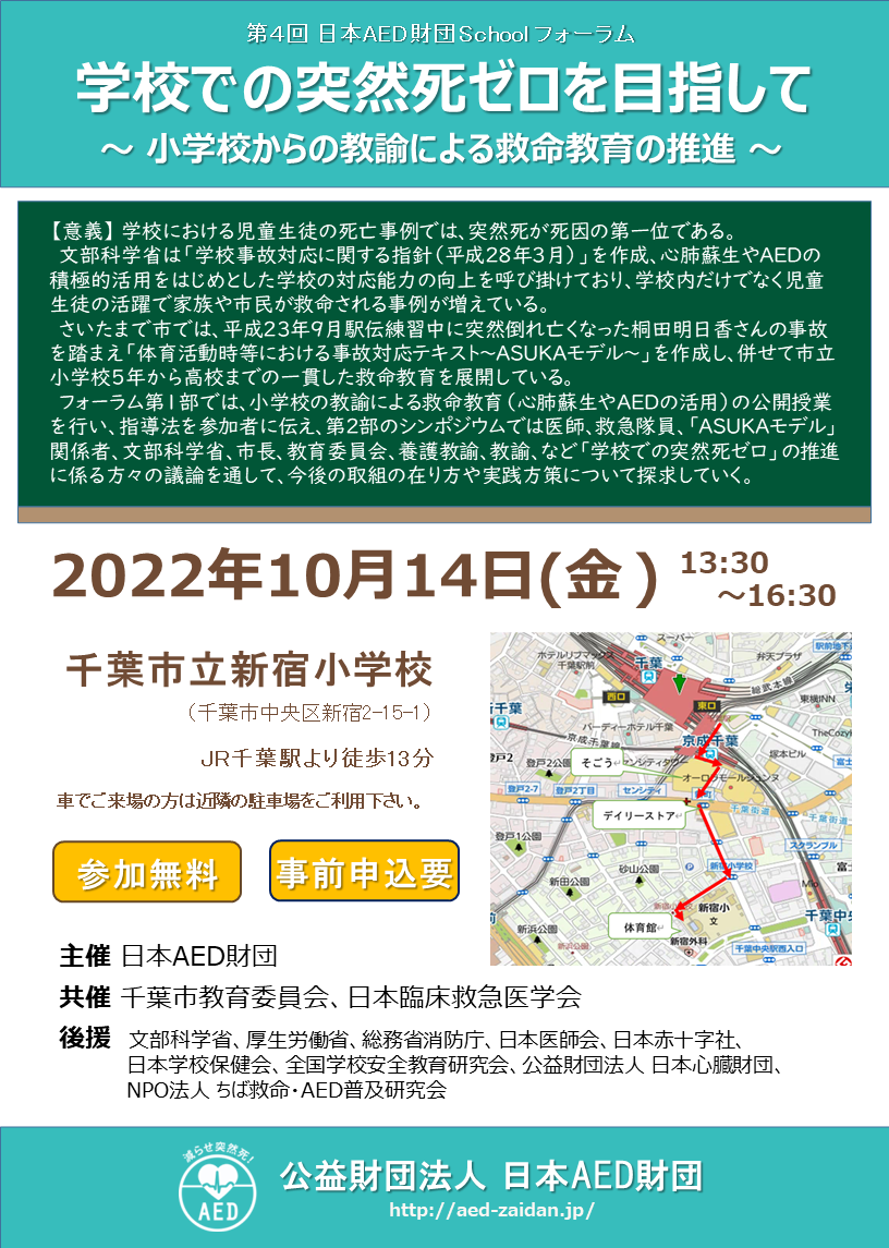 今年2月の開催を延期していた 第4回 日本AED財団Schoolフォーラム を2022年10月14日に開催することを決定いたしました。