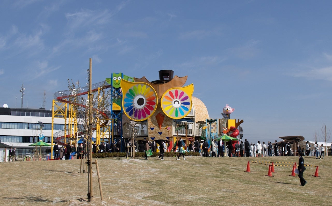 愛宕山ふくろう公園には、愛宕山の高台から夜中でも大きな目で、市民の皆さんの安心・安全を見守り続けられるよう「ふくろう」をモチーフとした大型複合遊具を整備しています。