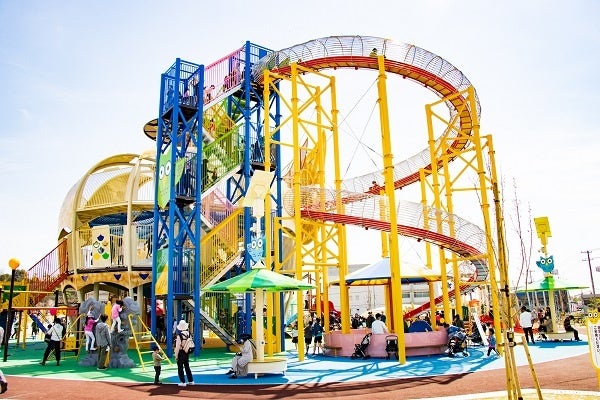 大型複合遊具には、高さ約13メートル、長さ約50メートルのローラー滑り台やトランポリンのような構造の二階部分、ミニボルダリング、小さな子どもも楽しめる遊具を備えています。