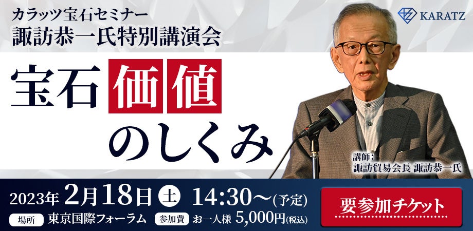 株式会社KARATZ(カラッツ)では、2023年2月18日(土)諏訪貿易会長 諏訪恭一氏を特別講師に迎え、『宝石「価値のしくみ」』についてのセミナーを開催いたします。
