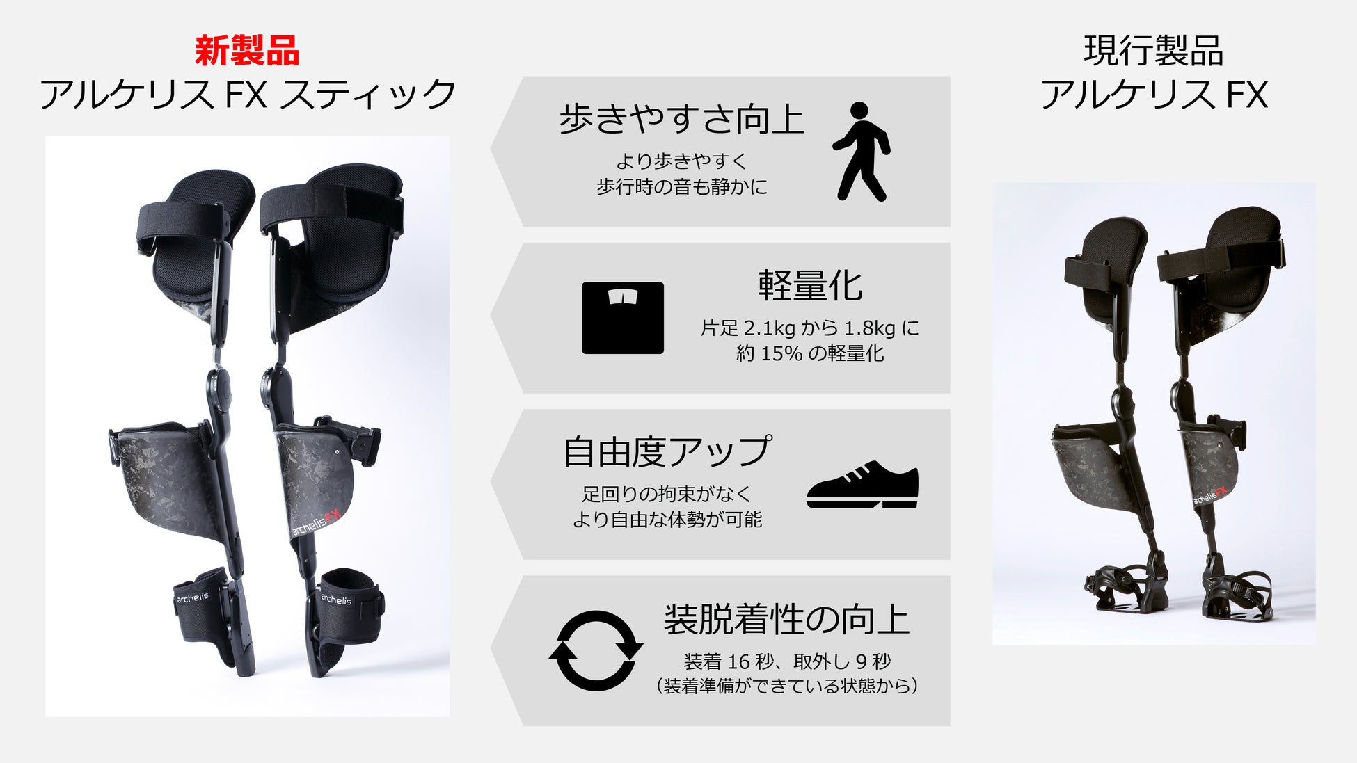 今回ご紹介する新製品「アルケリスFXスティック」は、2021年4月発売のカーボン素材の「アルケリスFX」の⾜元の形状を改良、約 25%軽量化し、”⽴ったまま座る”と”動きやすさ”を追求した製品となっております。
