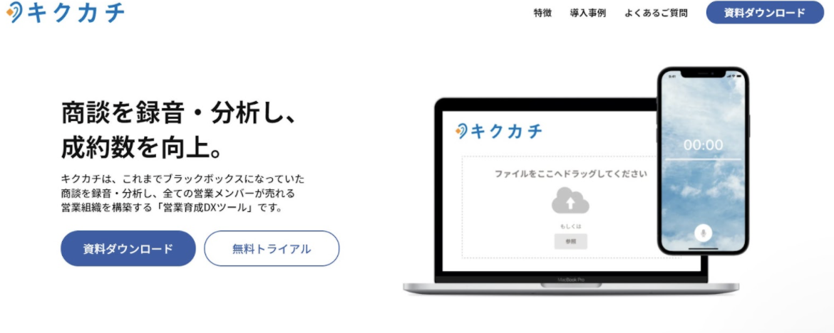 「キクカチ」はこれまでブラックボックスになっていた談を録音・分析し、全ての営業メンバーが売れる営業組織を構築する「営業育成DXツール」です。
