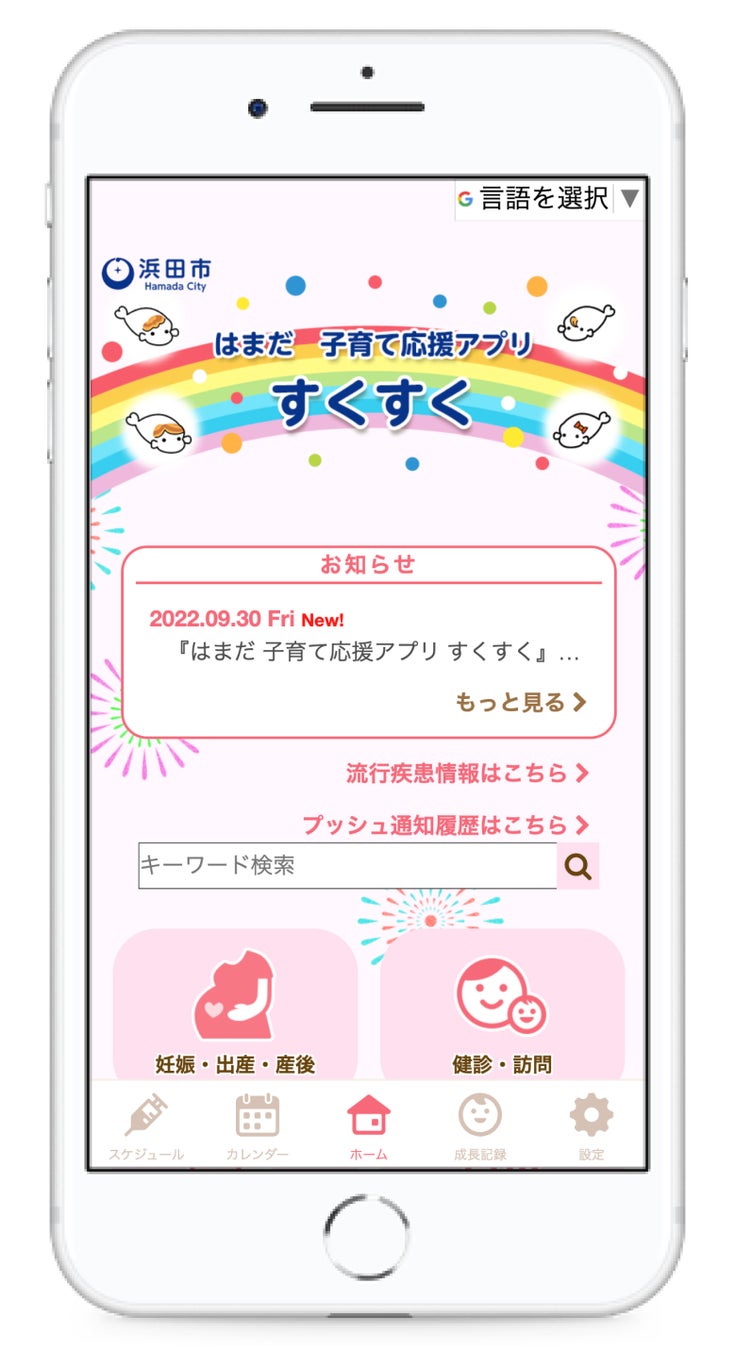 「子どもの育つ力」と「保護者の安心した子育て」を応援したいという想いを込めて、「はまだ 子育て応援アプリ すくすく」と命名しました。トップページには、地域の皆様にも馴染み深い すくすくキャラクター「いるかの家族」が登場。浜田市らしさが詰まった、こだわりのデザインでお届けします。