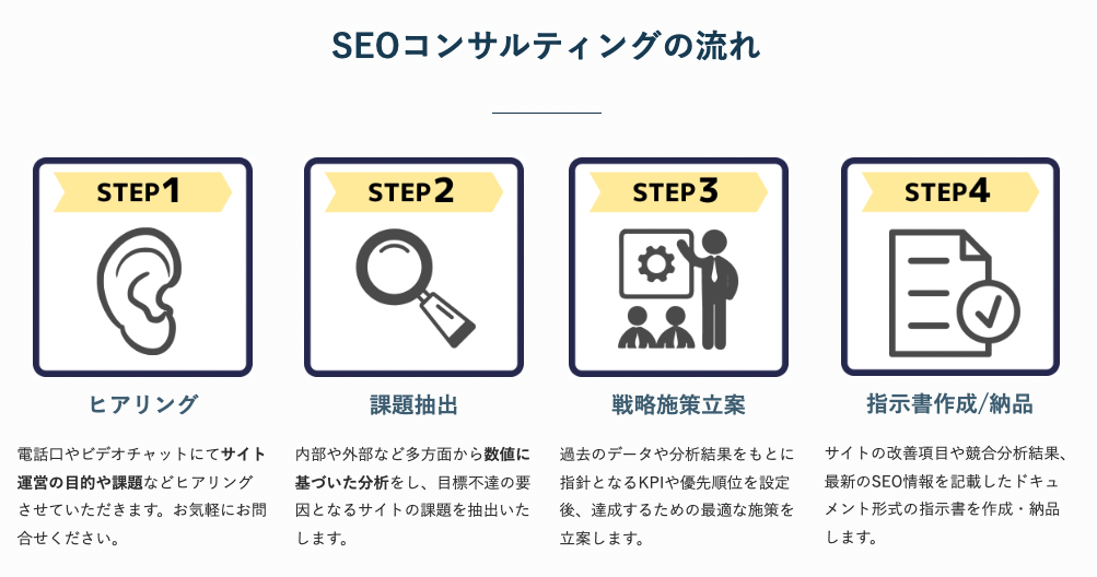 実際のSEOコンサルティングの流れも公開しております。ご依頼いただく際は、ヒアリングから指示書の作成まで「品質第一」で取り組みます。また、指示書のみならず実施までも対応しておりますのでお気軽にご相談ください。