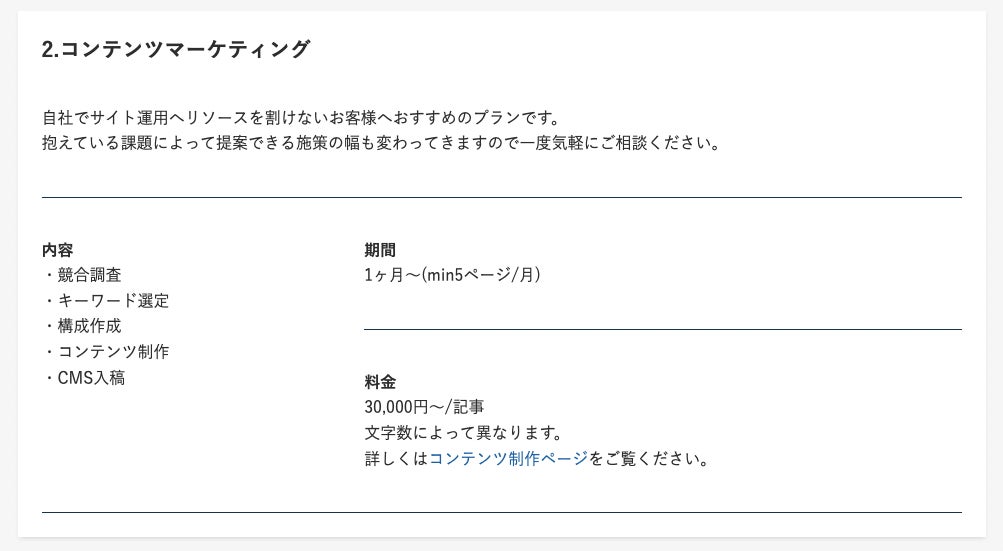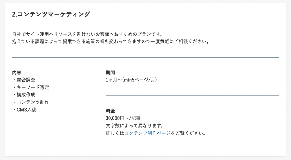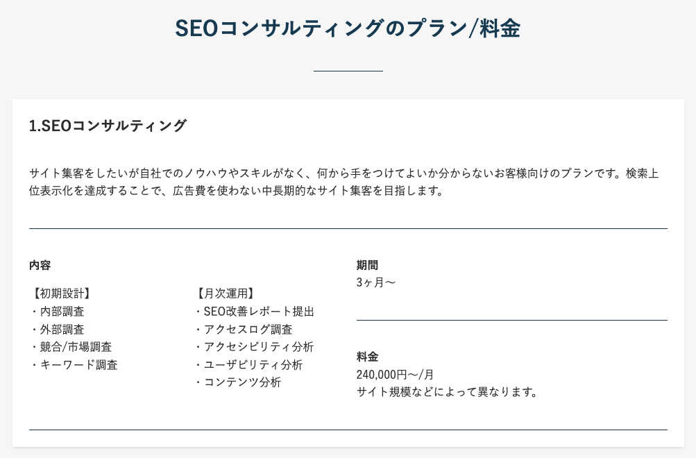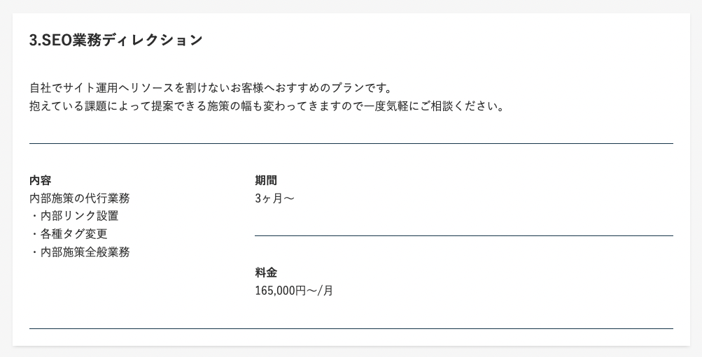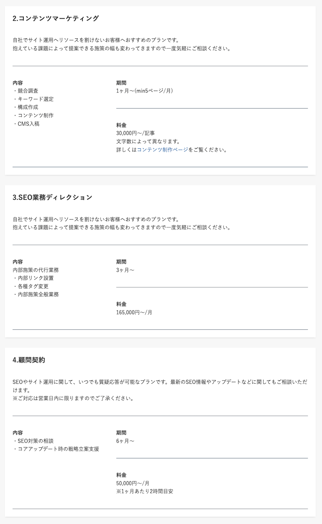 SEOコンサルティングのプランには「該当するお悩み」を始めとして、提供する施策の詳細や期間・具体的な費用まで細かく記載しております。