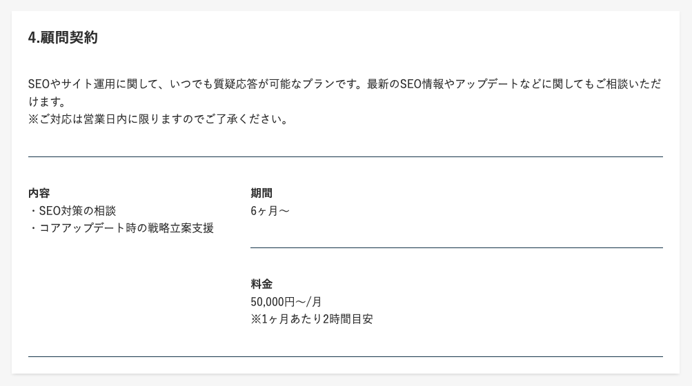 そういった課題とは別に「実施予定のSEO施策のメリット・デメリットのレビューをしてほしい」「SEO対策のプロから最新の情報を得たい」といった声にも向き合うべく、今回のSEO対策の顧問契約プラン設置に至りました。