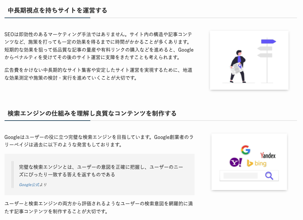 弊社にご依頼いただく、いただかないに関わらず、どのサイトでも運用時の基盤となる考え方です。クライアント様のサイトにおいても、最新のアルゴリズムや検索エンジンの評価軸を踏まえながら中長期目線でサイトに携わらせていただきます。