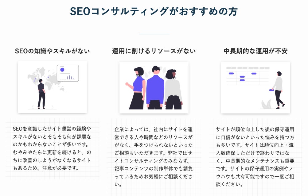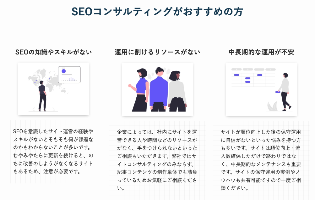 問い合わせの多くを占める悩みから「SEOコンサルティングがおすすめの方」を明示