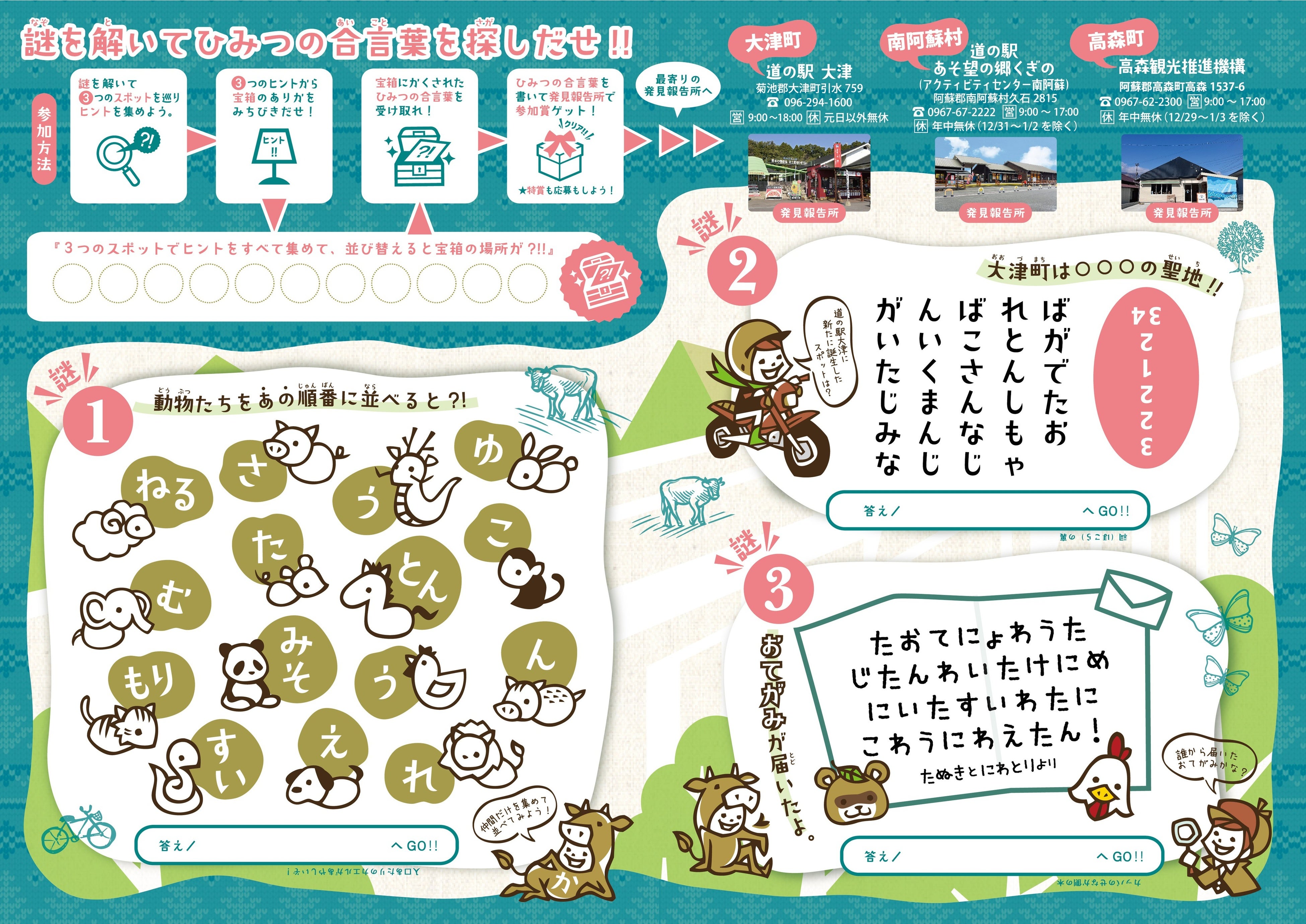 大津町・南阿蘇村・高森町の観光案内所などで謎が記載された「宝の地図」を入手して、宝探しの旅にでかけよう。