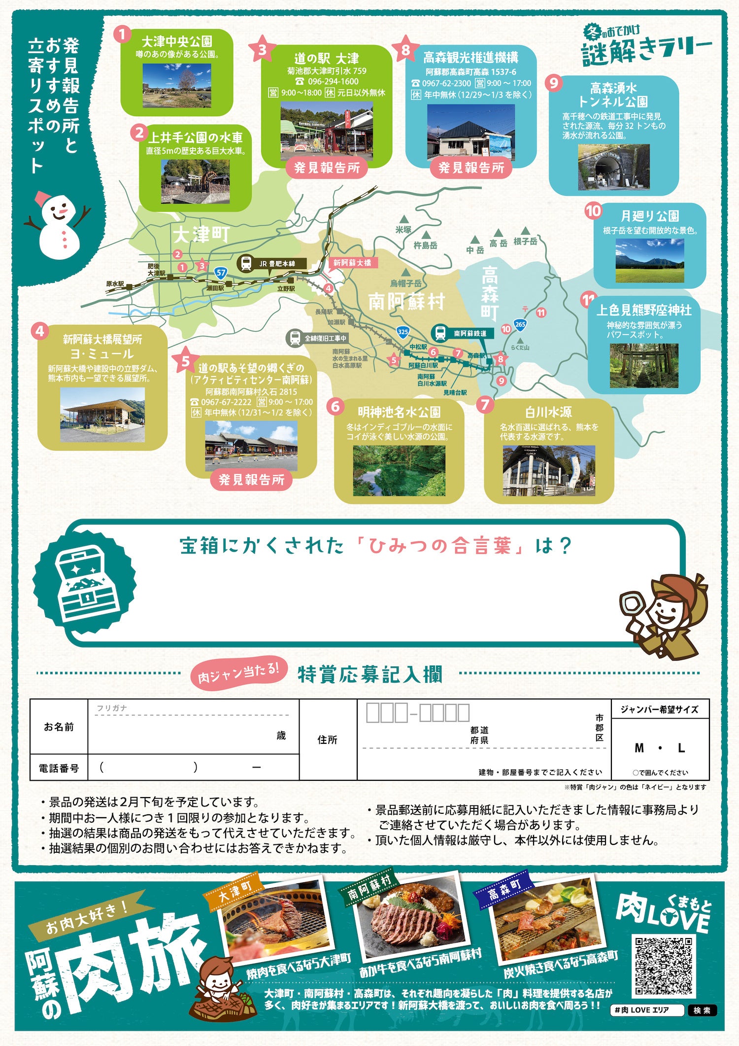今回、そんな新阿蘇大橋の周辺エリア(大津町・南阿蘇村・高森町)を楽しく巡る「新阿蘇大橋 冬のおでかけ謎解きラリー」を実施することとなりました。美味しいお肉提供点が集まる「肉LOVEエリア」としても人気のこのエリアへお出かけしてみてください。