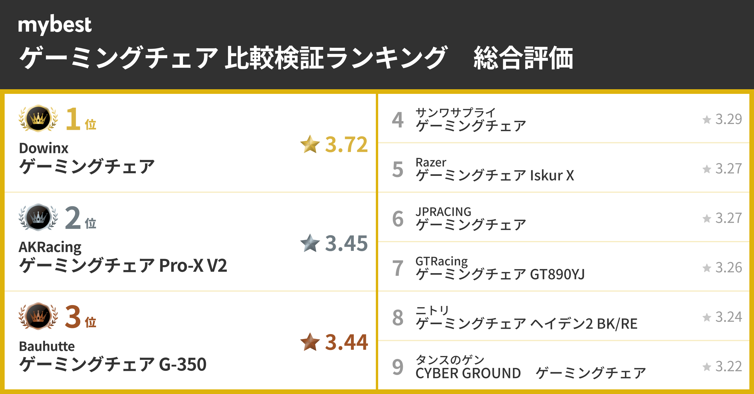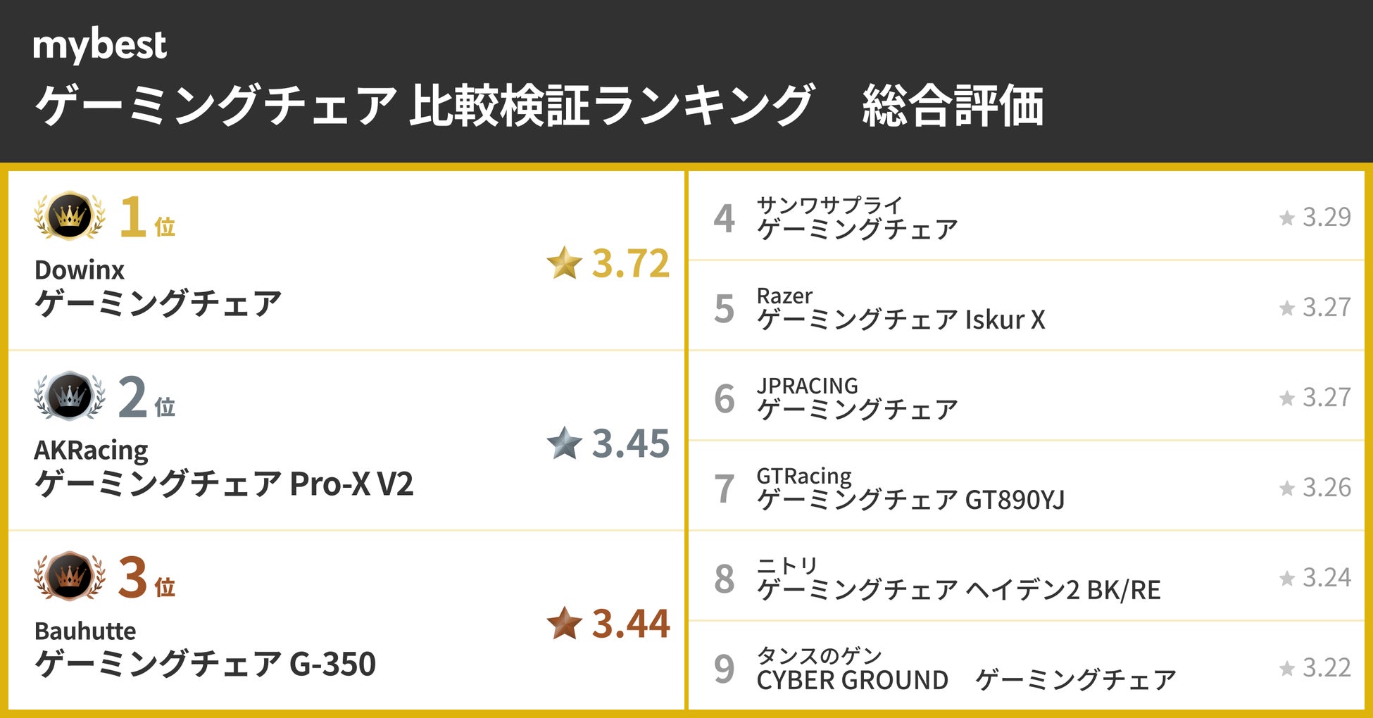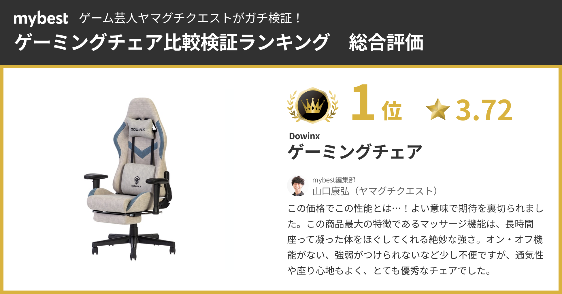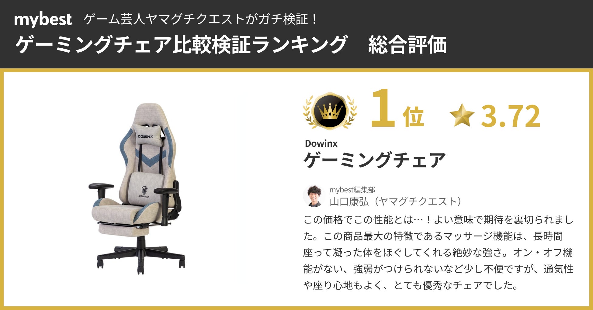 株式会社マイベスト(本社:東京都中央区、代表取締役CEO:吉川徹)が運営する、ユーザーに最高の選択体験を提供するおすすめ情報サービス「mybest」は、人気のゲーミングチェアについてゲーム芸人「ヤマグチクエスト」こと山口康弘氏と編集部による検証調査を実施し、その結果をサイト内(https://my-best.com/12990)にて公開しました。