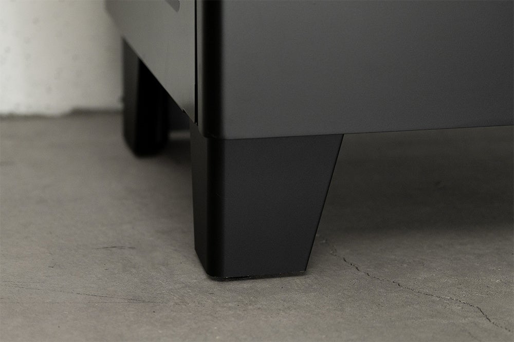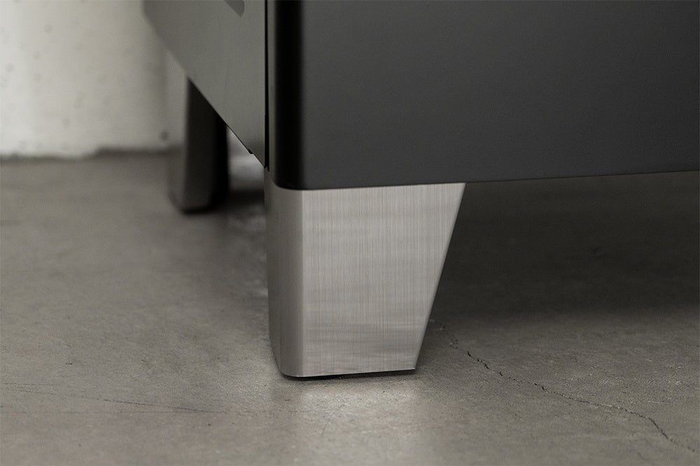 本体ハンドル部分と同じステンレス素材を採用。脚にもステンレスを使うことによりアクセントとしてのシルバー色をより強調させます。これにより本体のスクエア感を強調し一枚扉と窓の存在感を際立たせます。