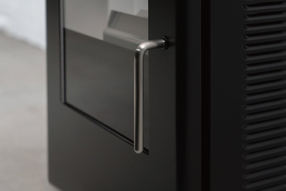 シンプルな意匠を象徴する扉は、炎が主役となるよう、継ぎ目のない一枚の板金からできています。重厚感のある黒色の扉は、炎のオレンジ色をより強調させ、美しさを引き立ててくれます。