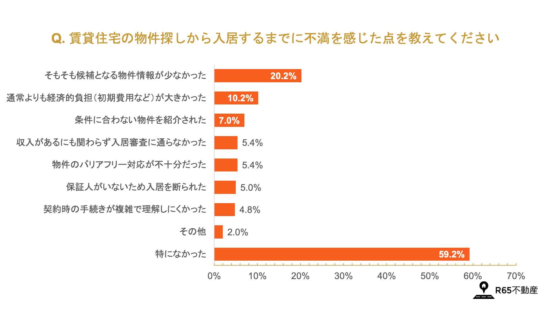賃貸住宅の物件探しから入居するまでに不満を感じた点では、「そもそも候補となる物件情報が少なかった(20.2%)」が最も多く、2位が「通常よりも経済的負担(初期費用など)が大きかった(10.2%)」、3位が「条件に合わない物件を紹介された(7.0%)」となりました。また、59.2%の方は「特になかった」と回答しています。