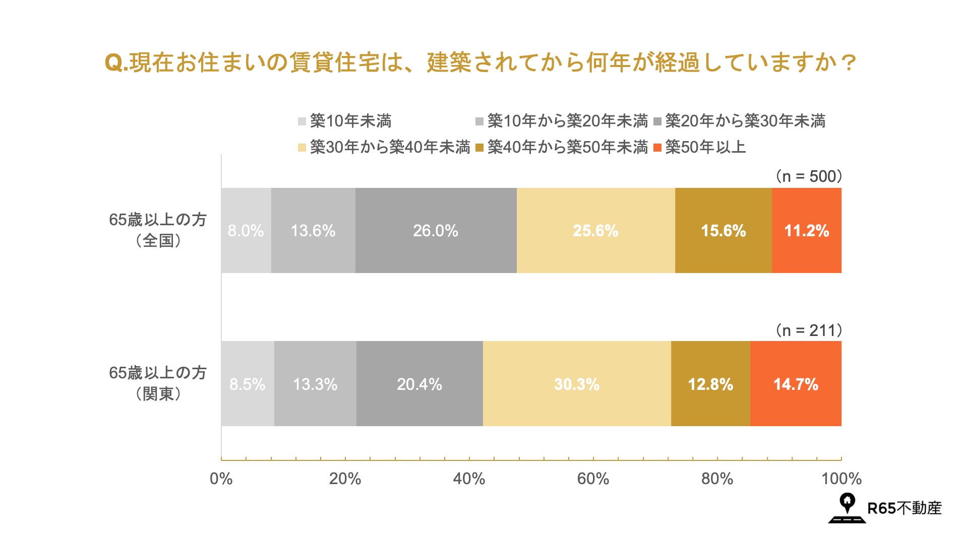 また、関東では「築30年以上から築40年未満」が全体よりも4.7%多く30.3%、「築50年以上」が3.5%多い14.7%となり、「築30年以上」の賃貸住宅に住んでいる高齢者は57.8%となりました。