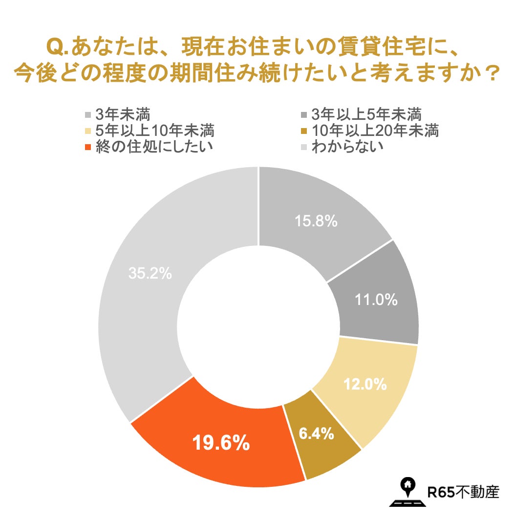 一方で、現在の住まいに今後どの程度の期間住み続けたいと考えているかについては、「わからない」が35.2%だったものの、「終の住処にしたい」が最も多く19.6%となりました。また、「5年以上20年未満」が18.4%。となっています。
