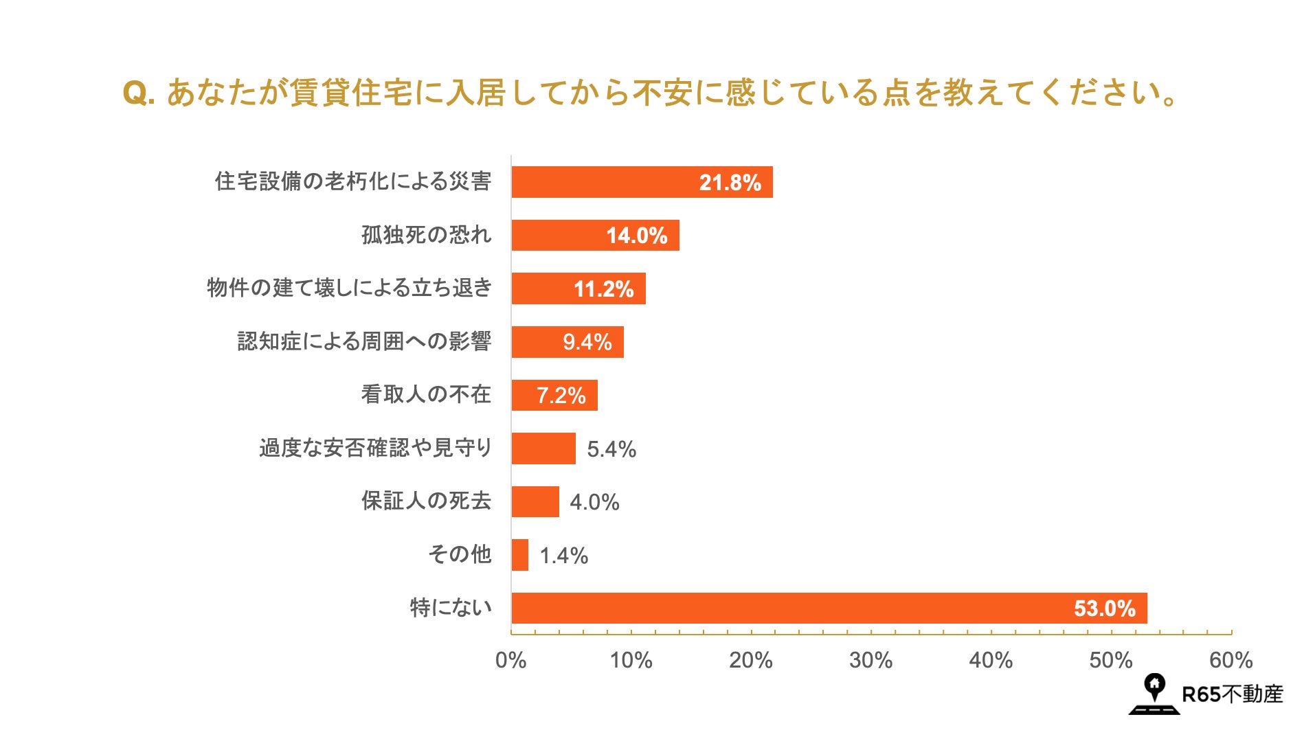 賃貸住宅に入居してから不安に感じている点に関しては、「住宅設備の老朽化による災害(21.8%)」が最も多く、2位が「孤独死の恐れ(14.0%)」3位が「物件の建て壊しによる立ち退き(11.2%)」となりました。また、53.0%の方は「特にない」と回答しています。