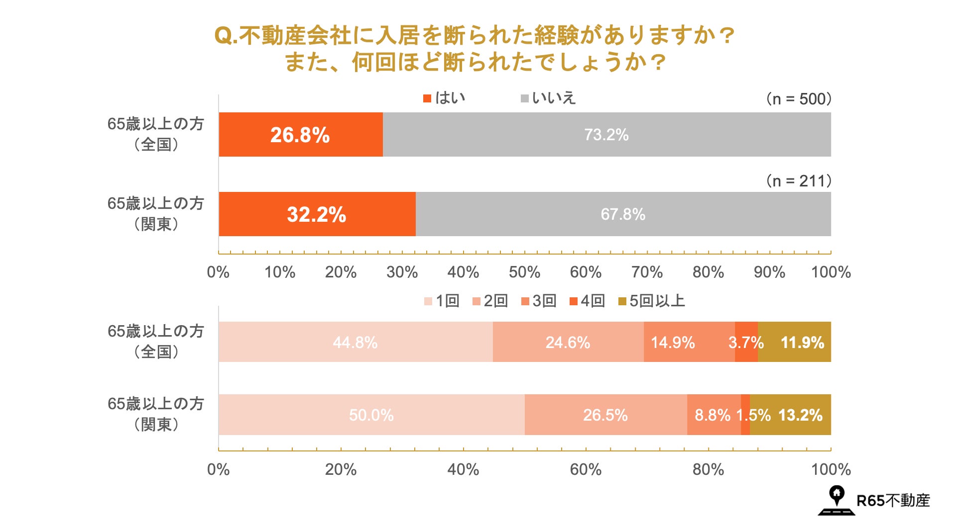 全体のうち「年齢を理由に賃貸住宅への入居を断られた経験のある高齢者」は26.8%となり、そのうち、「5回以上断られた経験のある方」は11.9%となりました。また、関東(1都6県)では全体の1.2倍多く、32.2%の高齢者が年齢を理由とした入居拒否を経験している結果結果となりました。