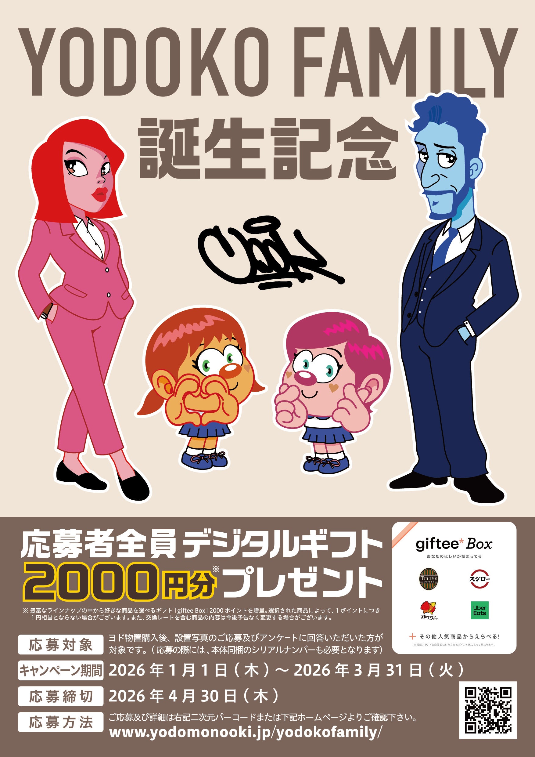 株式会社ヨドコウ(代表取締役社長 田中栄一)は、ヨド物置の公式キャラクター「YODOKO FAMILY(ヨドコウファミリー)」の誕生を記念して、「YODOKO FAMILY誕生記念 デジタルギフトがもらえる施工例キャンペーン」を2026年1月1日より開催いたします。