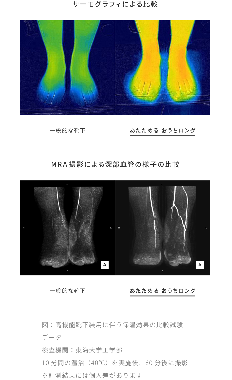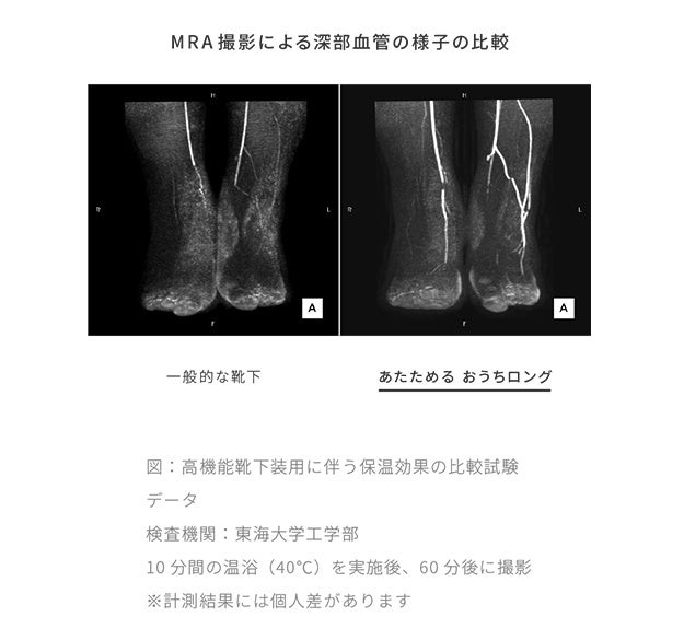 足は身体の中で末端に位置しているため、血液が行きわたりにくく、特に冷えやすい部位と言われています。ケアソク〈あたためる〉は足本来の熱を逃がさず保護することで、足もとの冷えを予防・緩和。従来のフットウェアよりも長時間の保温効果が持続します。