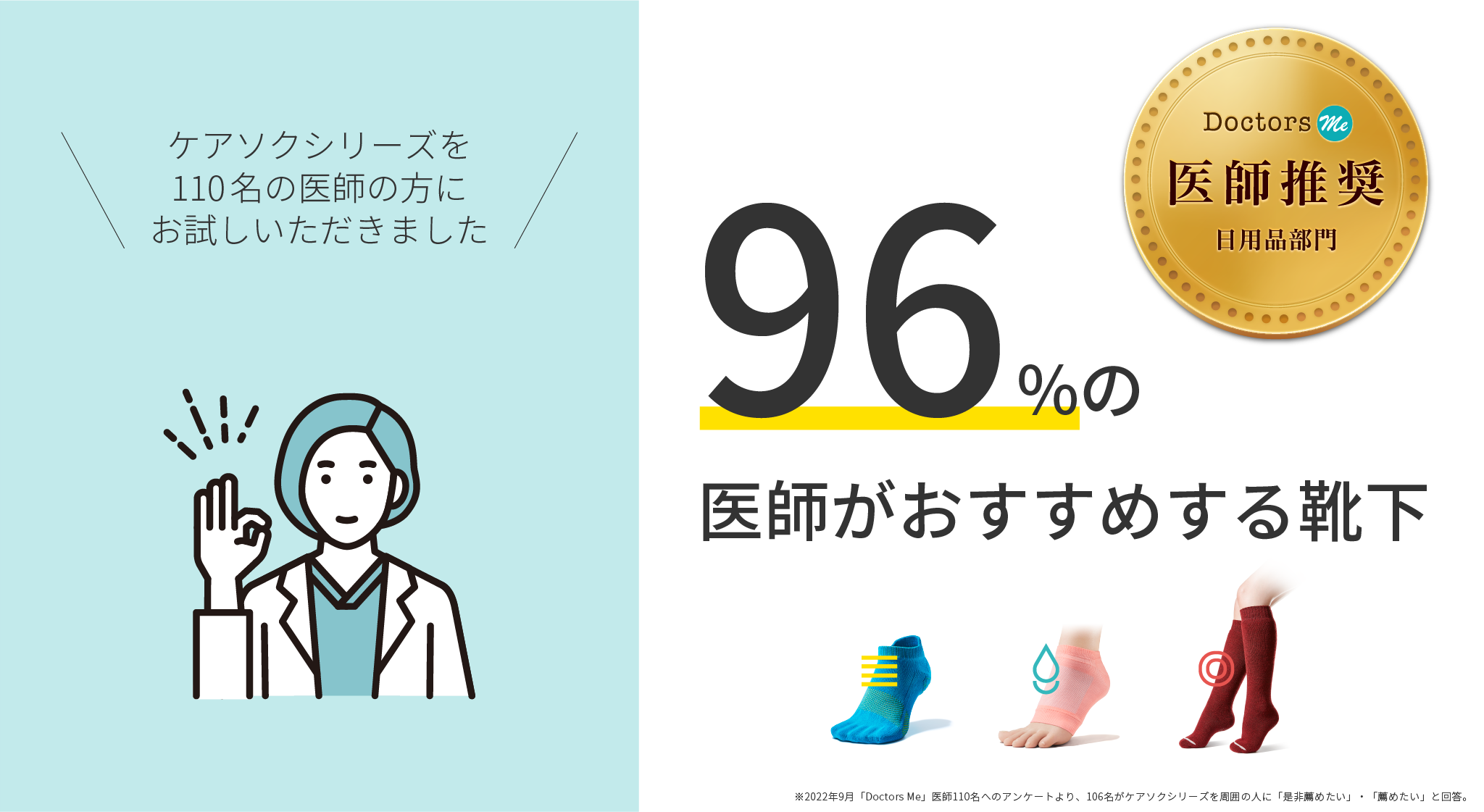 この度、ケアソクシリーズをより安心してお客様に選んでいただくため、「Doctors Me」医師モニター評価サービスを利用して、整形外科医・皮膚科医による第三者評価を実施しました。サンプリングアンケートの結果、110名中106名が「周りの方にお薦めしたい」と回答(※1)。約96%の医師が推奨を示す結果となり、一般的な靴下として初めて「医師推奨マーク」(※2)を取得いたしました。