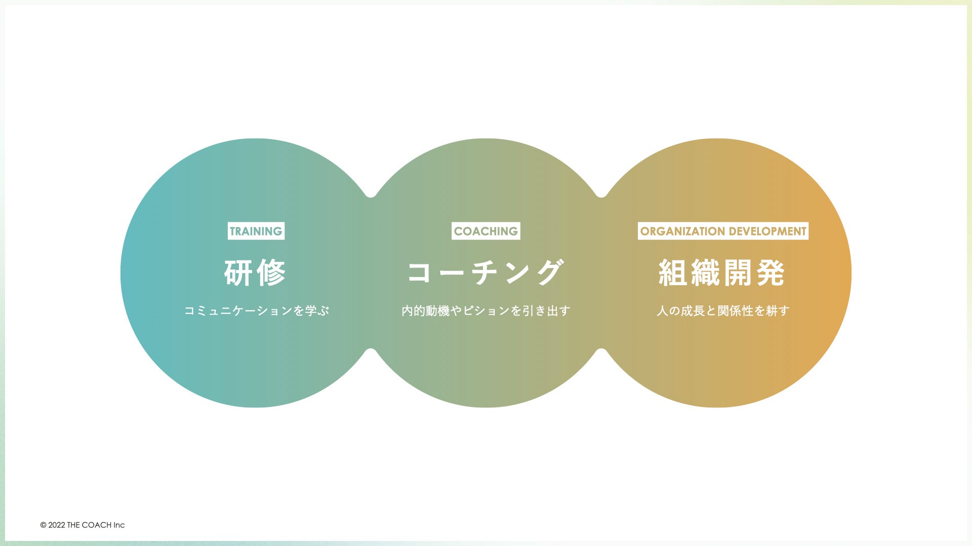 コーチングで個人の力を引き出しながらも、研修や組織開発を通じて組織の力へとつなげていきます。