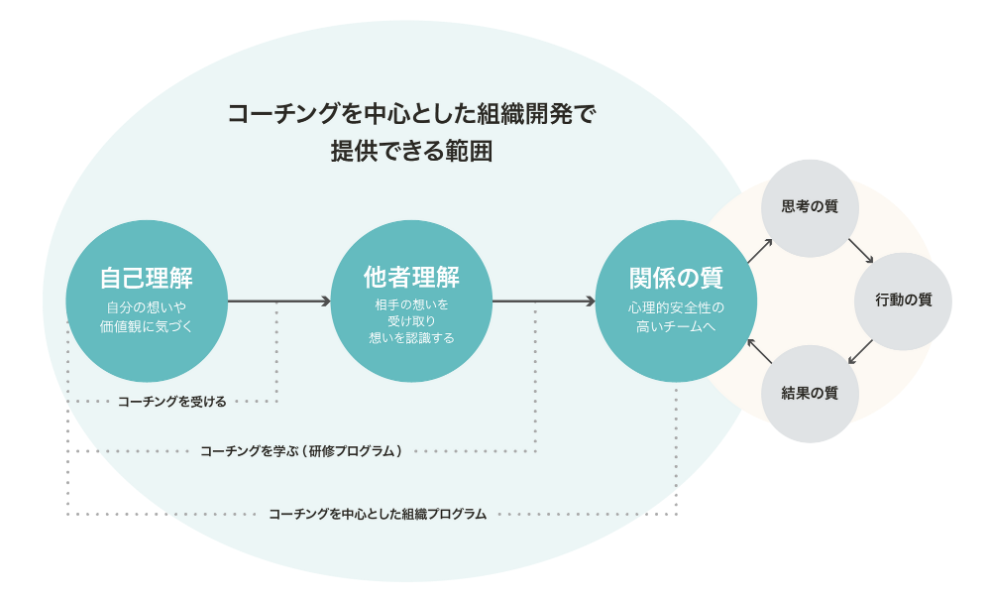 「人と関係性を起点とした組織」への移行の鍵は、役職や役割をわきに置いた1人の人間同士として向き合うことだと考えています。そのため、THE COACH for Businessでは、自己理解と他者理解から始まるアプローチを採用しています。
