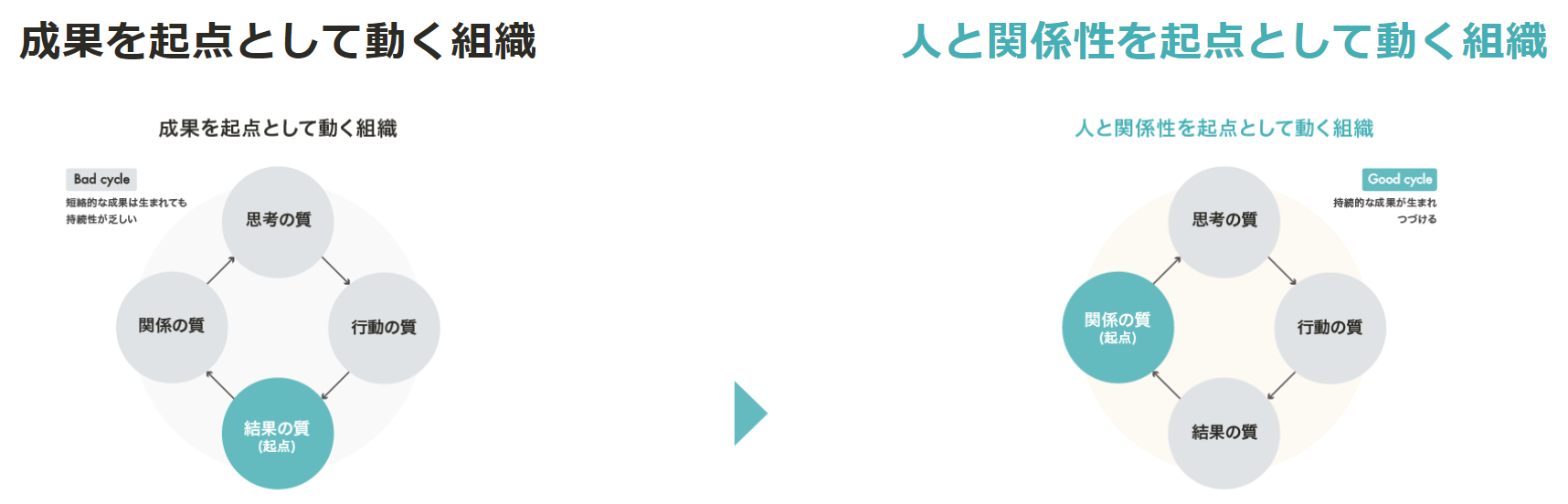 私たちは、組織が持続的に成果を出し続ける上で「人と関係性を起点として動く組織」への移行が重要であると考えています。