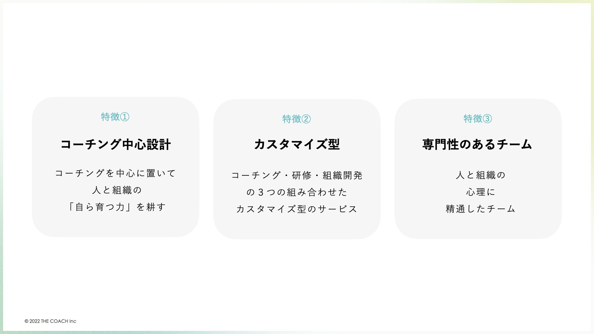 ②1on1のコーチング、研修、組織開発を組織の課題に合わせてカスタマイズしてご提案・ご提供する、包括的なサービスであること
