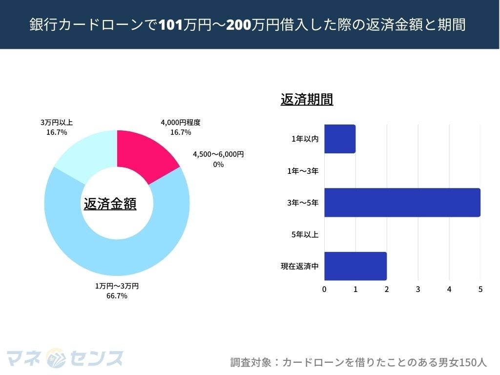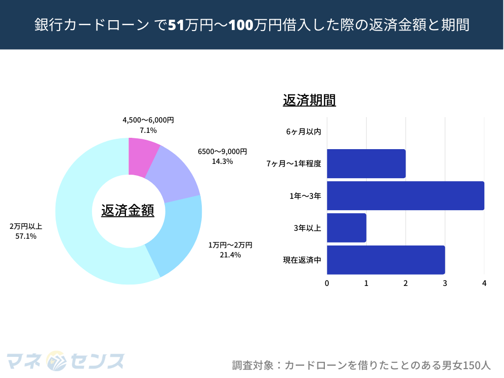 銀行カードローンで51万円〜100万円借りた人の返済金額は1〜3万円以上、返済期間は1年〜3年が最も多いという結果が得られました。