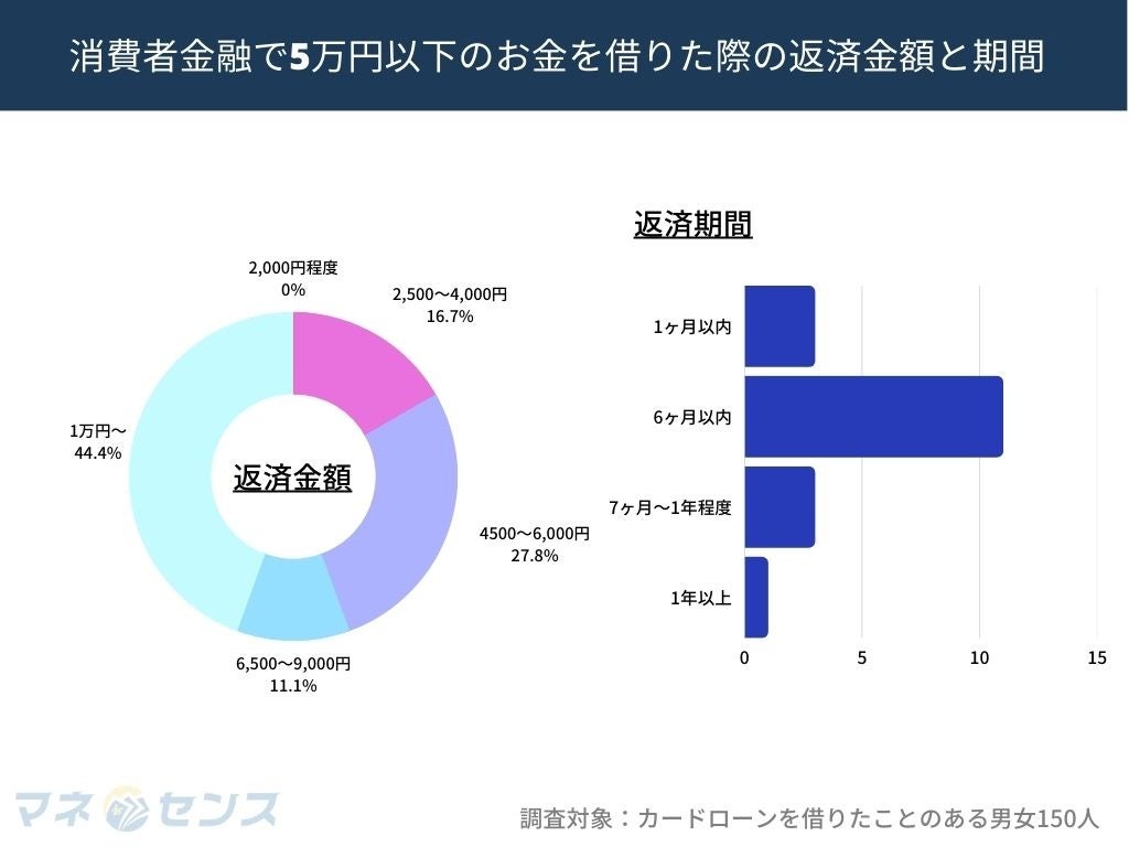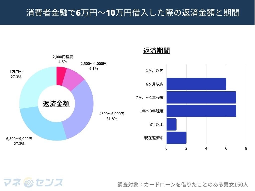 消費者金融で6万円〜10万円円借りた人の月々の返済額は「4,500円〜6,000円」が最も多いという結果が得られました。