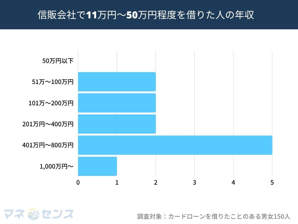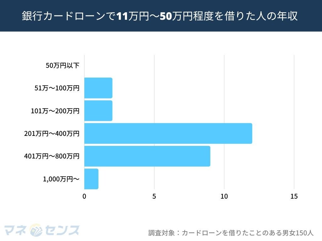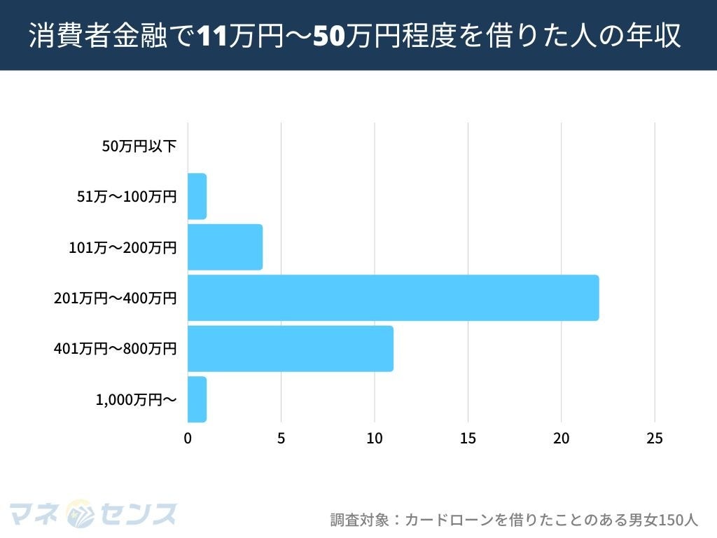 11万円〜50万円借りた人の年収は、消費者金融と銀行では201万円〜400万円が最も多く、おおよそ同じ傾向がみられました。