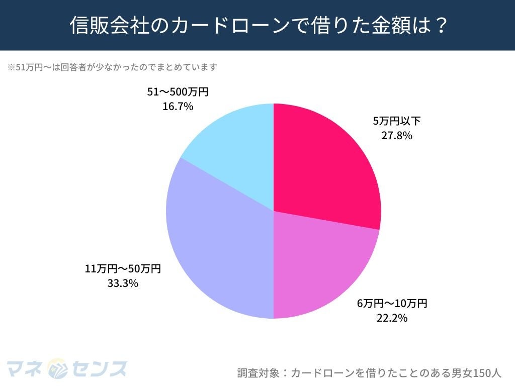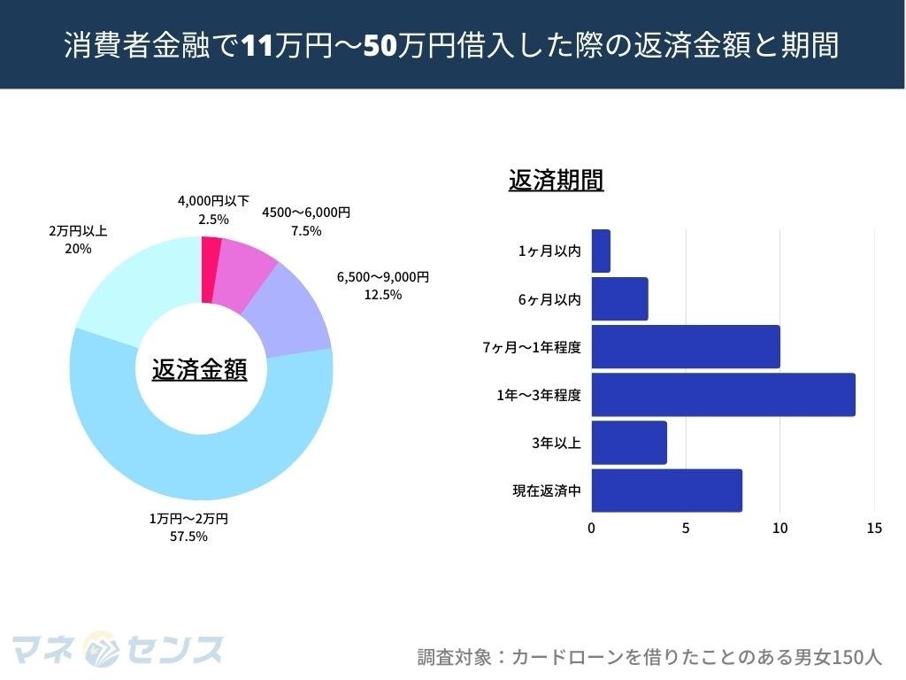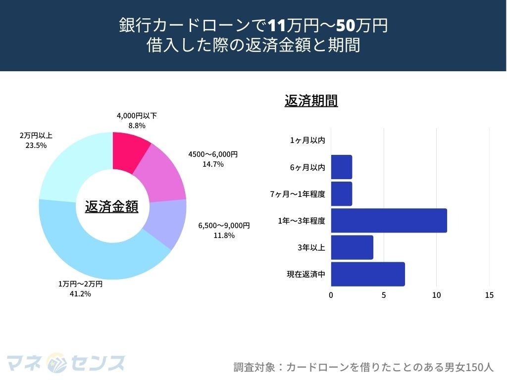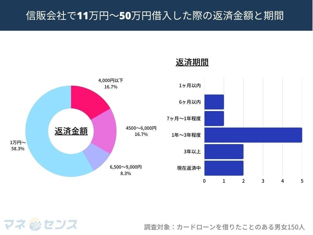 信販系カードローンで11万円〜50万円借りた人についても、返済金額や返済期間はおよそ消費者金融や銀行と同じです。