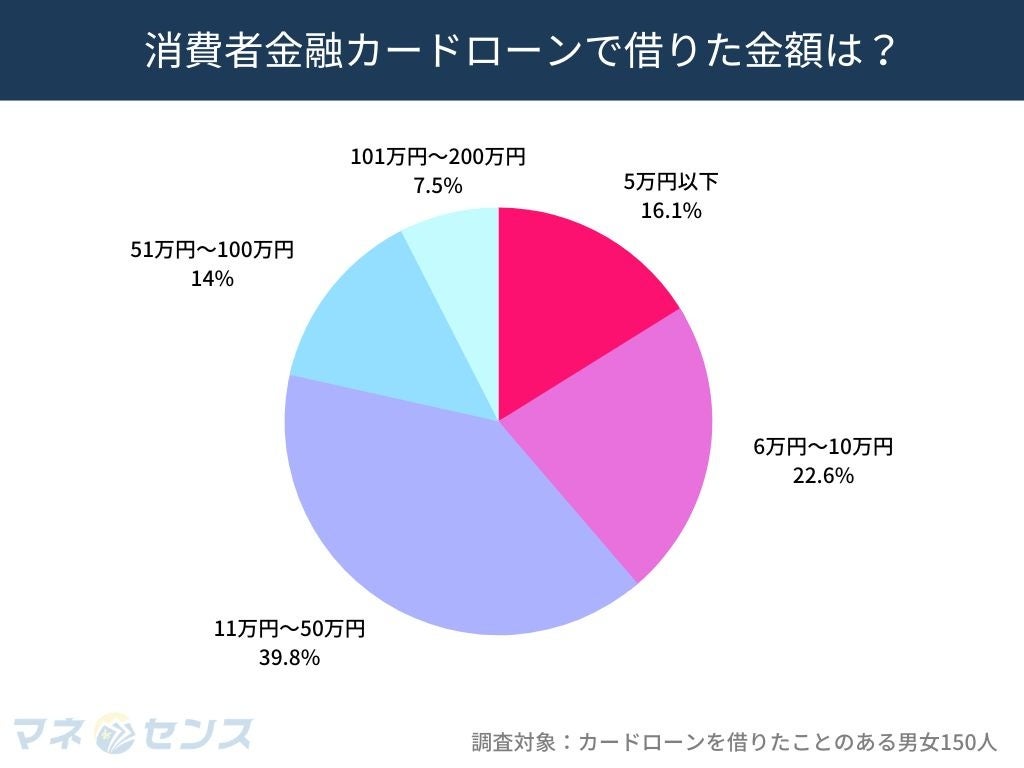 11万円〜50万円程度の金額帯は、消費者金融・銀行カードローン・信販系カードローン全種類のカードローンにおいて最も多く借入されている金額でした。
