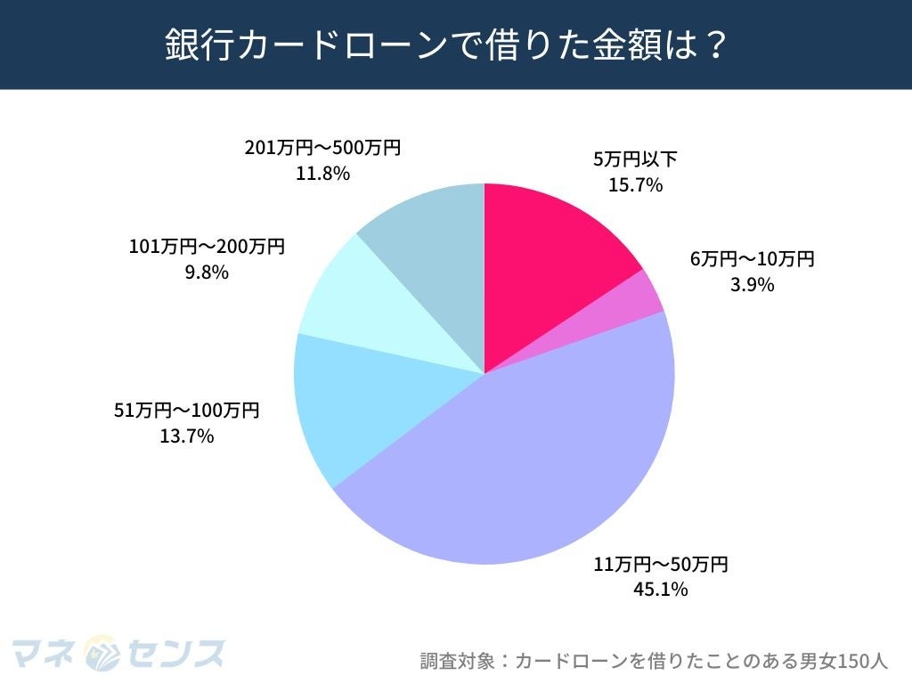 銀行カードローンでは、51万円〜100万円・101万円〜200万円・201万円〜500万円の金額帯も多く借入されていました。