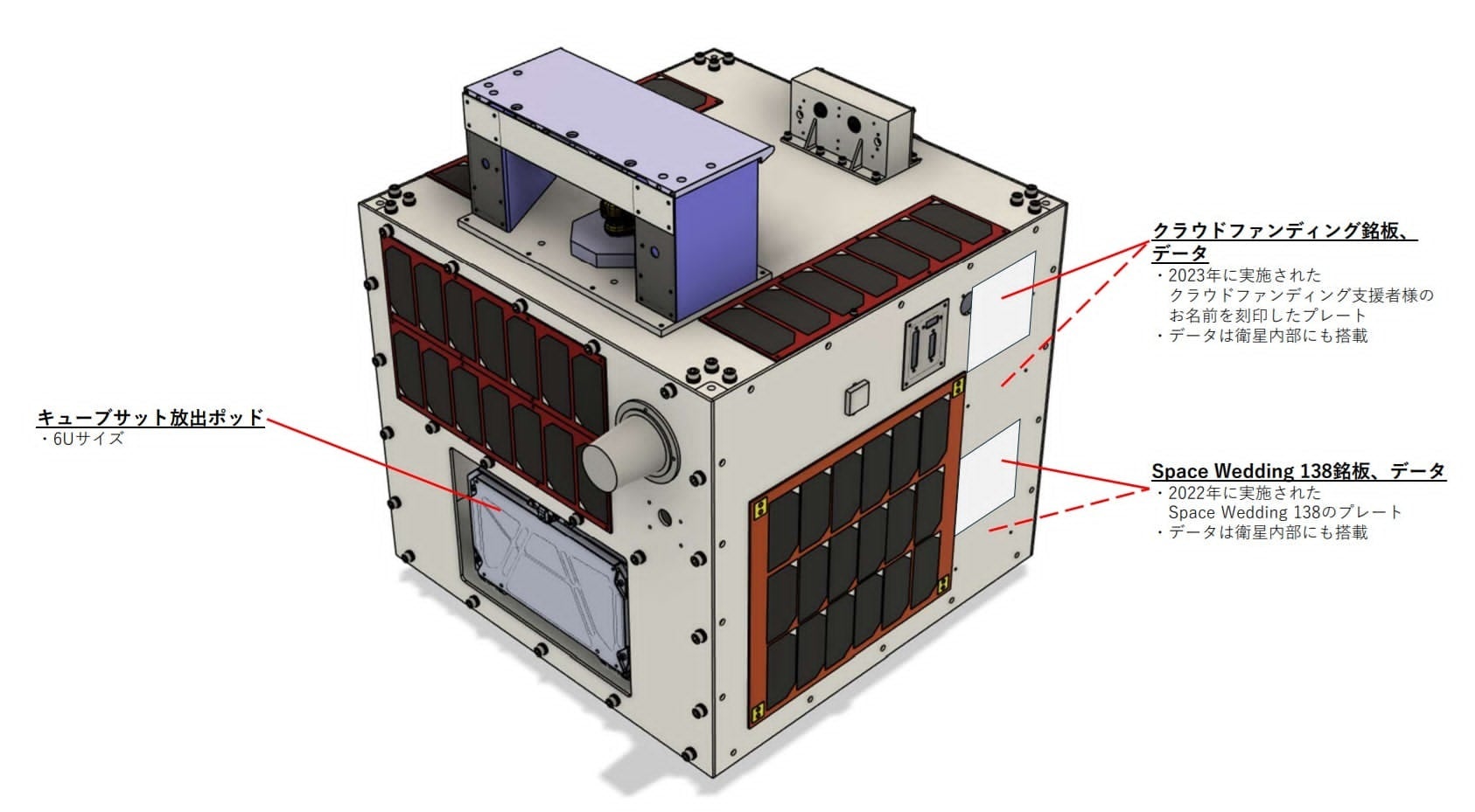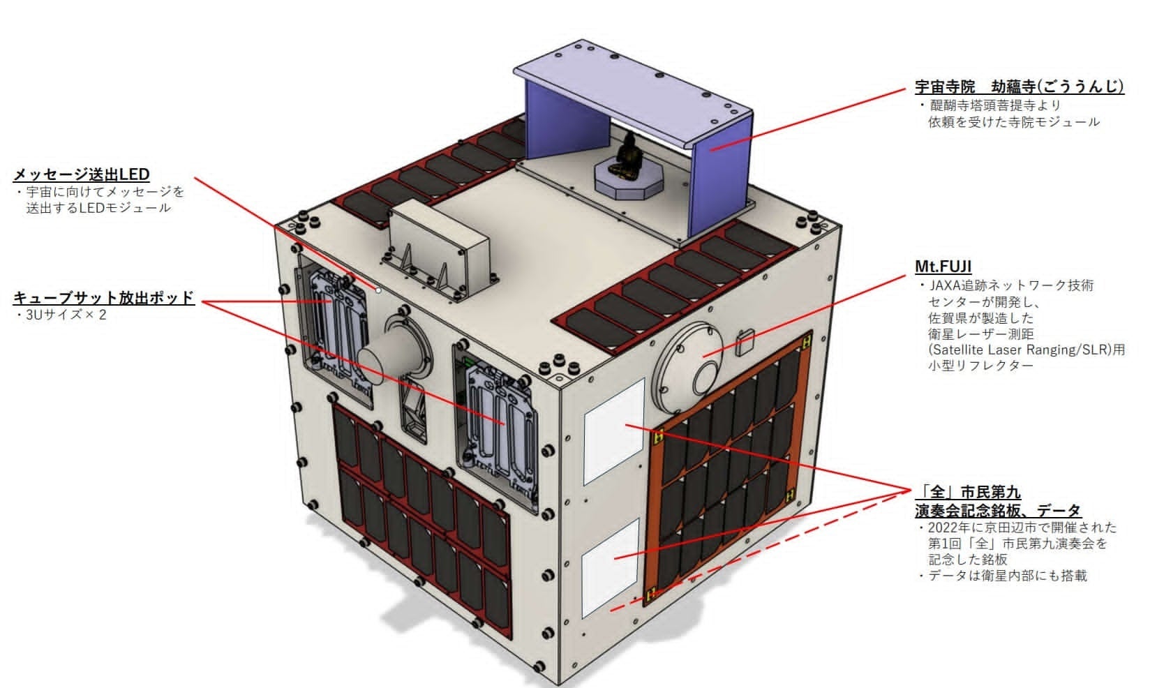 本衛星には、醍醐寺塔頭菩提寺より依頼を受けた「宇宙寺院 劫蘊寺(ごううんじ)」や、JAXA追跡ネットワーク技術センターが開発し、佐賀県が製造した衛星レーザ測距(Satellite Laser Ranging/SLR)用小型リフレクター「Mt.FUJI」など、複数の機器を搭載しており、宇宙用部品等の軌道上実証を行います。